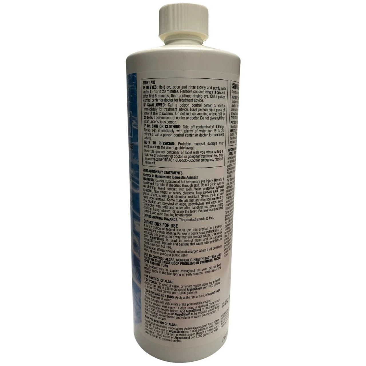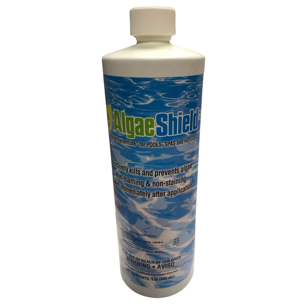 Not for use in Baquacil Pools One quart of Pristine Blue Algae Shield treats up to 32,000 gallons of pool water. Application should be made monthly. This Copper based Algicide will prevent all types of Algae from growing in your swimming pool. Most algae products on the market are made for use after an ugly outbreak of algae occurs. Algae Shield actually prevents ugly green water with just one ounce per 1,000 gallons, once a month. Algae Shield’s special formula evenly disperses so every ounce of your water is protected against algae. If there’s no algae present in the water, Algae Shield stands guard. When algae spores enter the water, Algae Shield is ready! It kills algae before it multiplies and becomes an unsightly mess in your pool.
