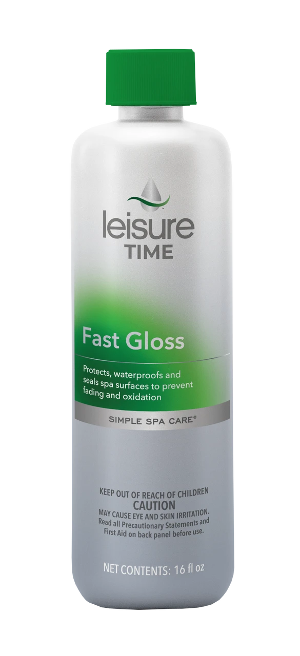 Leisure Time Fast Gloss, a specially formulated polish and cleaner crafted from reactive silicones. This advanced solution meets contemporary performance standards, offering durability, a deep gloss, water repellency, and effortless application without streaking or smearing. Fast Gloss features a protective coating that remains resilient against sunlight, temperature fluctuations, and spa chemicals.