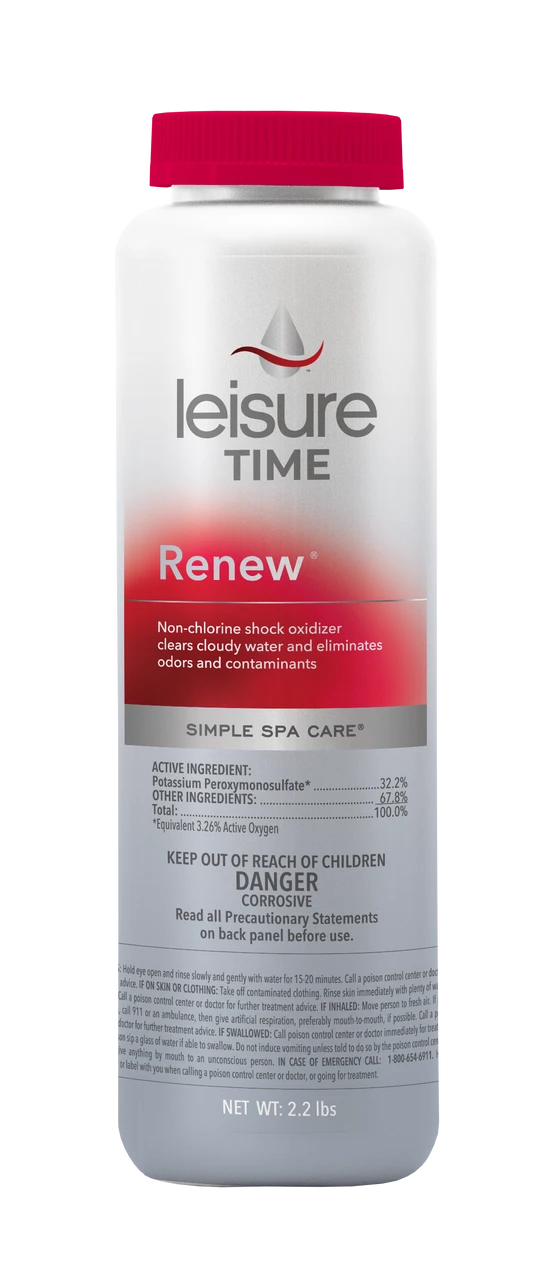 Renew non-chlorine shock oxidizer is a fast-dissolving granular that rids spa water of residual soaps, deodorants, natural oils and organic materials that can build up in spa water. When Leisure Time Spa Shock Renew a non-chlorine shock oxidizer is added to the spa water, it reacts with the bromide and forms a bromine solution to destroy any microorganisms left behind by the bather. Part of the Reserve & Renew Chlorine-Free Sanitizing System.