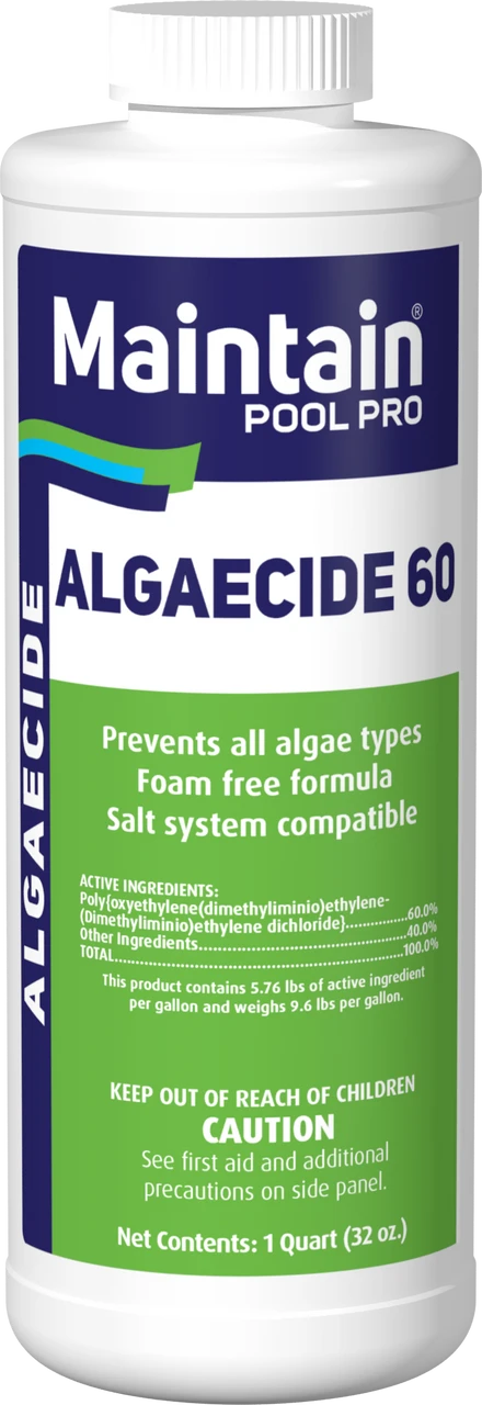 Potent algaecide with an impressive 60% strength, this solution stands out for its effectiveness in both weekly preventive treatments and clearing up existing algae issues. This 60% algaecide is used to control the growth of all algae in swimming pools. Maintain Algaecide 60 works great as a weekly maintenance algaecide to control algae outbreaks.