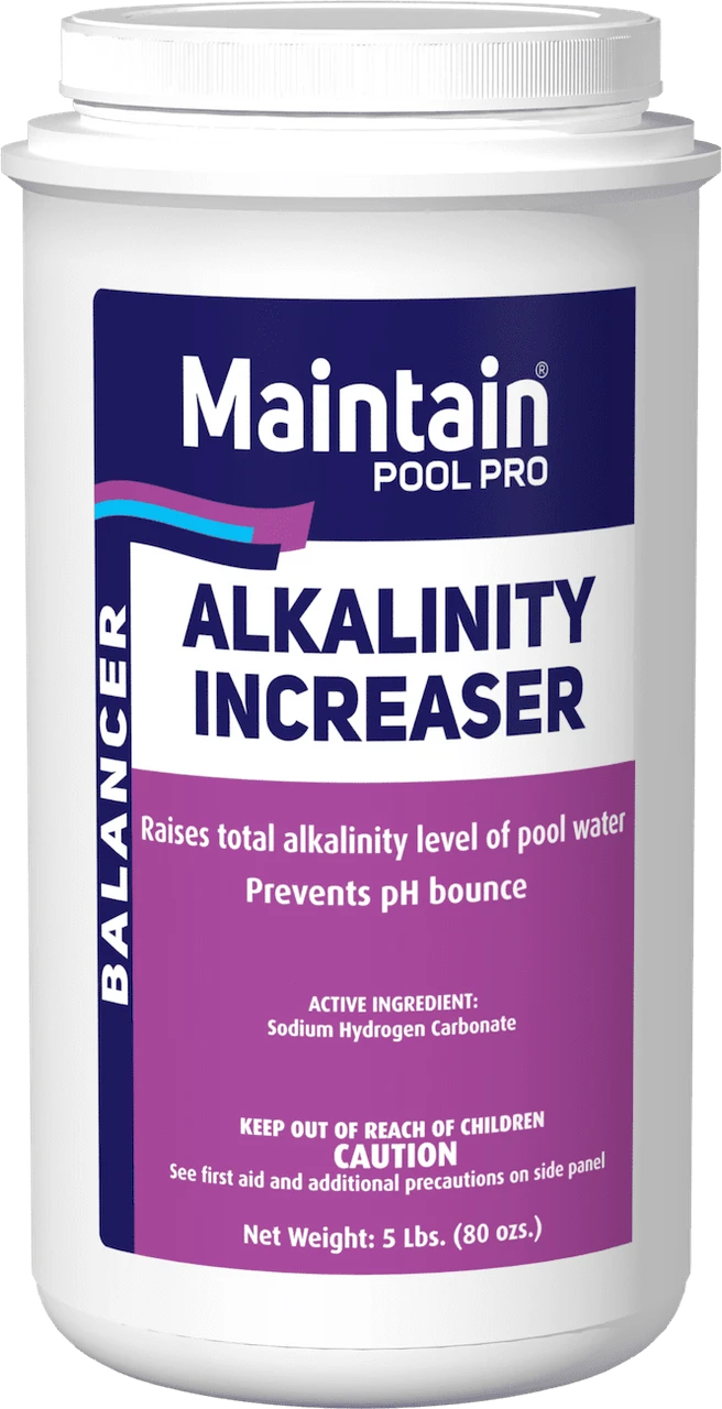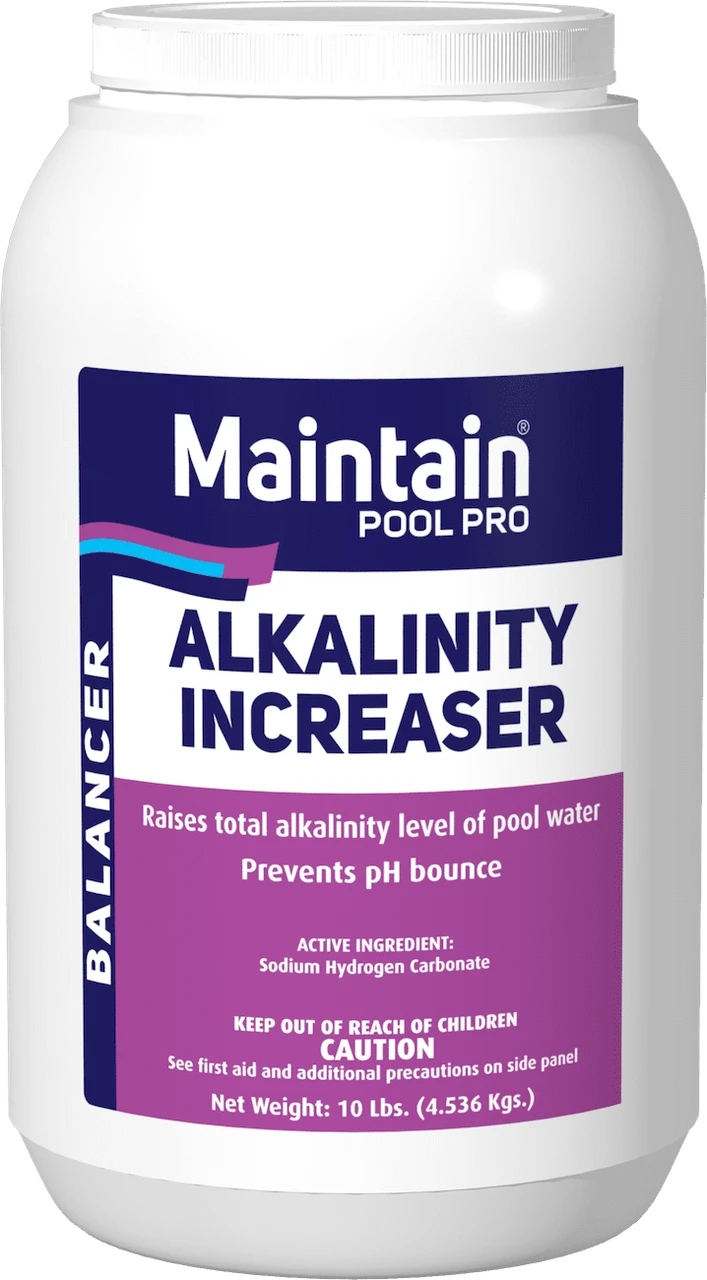 Raise your swimming pool or spas total Alkalinity with our premium Alkalinity Increaser by Maintain. Alkalinity is one of the most important pool water balance properties! Low Alkalinity can cause pH levels to fluctuate. While high alkalinity levels can casue pH to resist adjustment, create cloudy water, or even scale.
