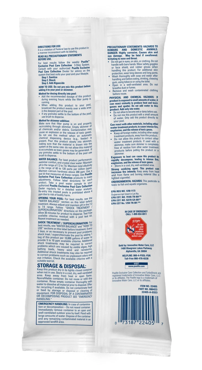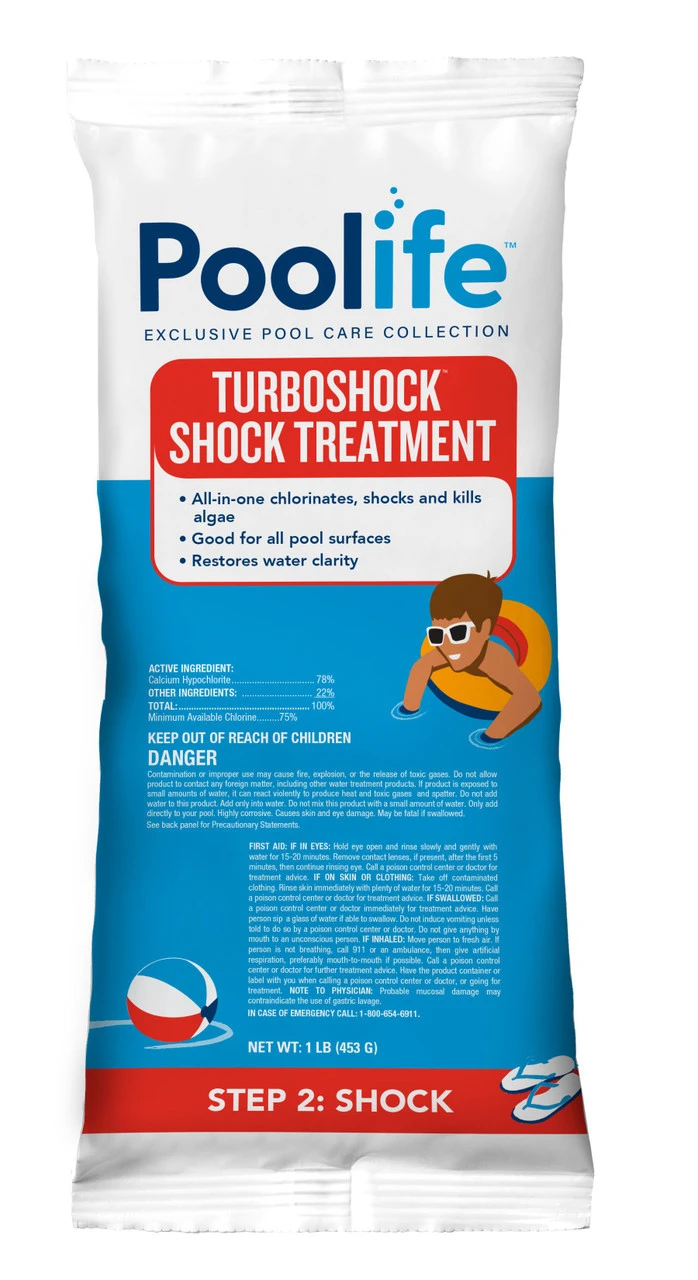 Poolife’s TurboShock 78% calcium hypochlorite formula ensures your swimming pool stays clean all summer long. Poolife TubroShock rapidly dissolves to combat algae & bacteria making it one of the strongest calcium hypochlorite available on the market! additionally Poolife® TurboShock is an amazing weekly shock treatment—no pre-dissolving required.