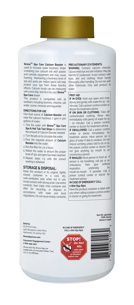 Sirona™ Calcium Booster, a liquid solution designed to elevate your spa experience by swiftly increasing water calcium hardness, preventing equipment corrosion, and ensuring a soothing and clean spa environment.