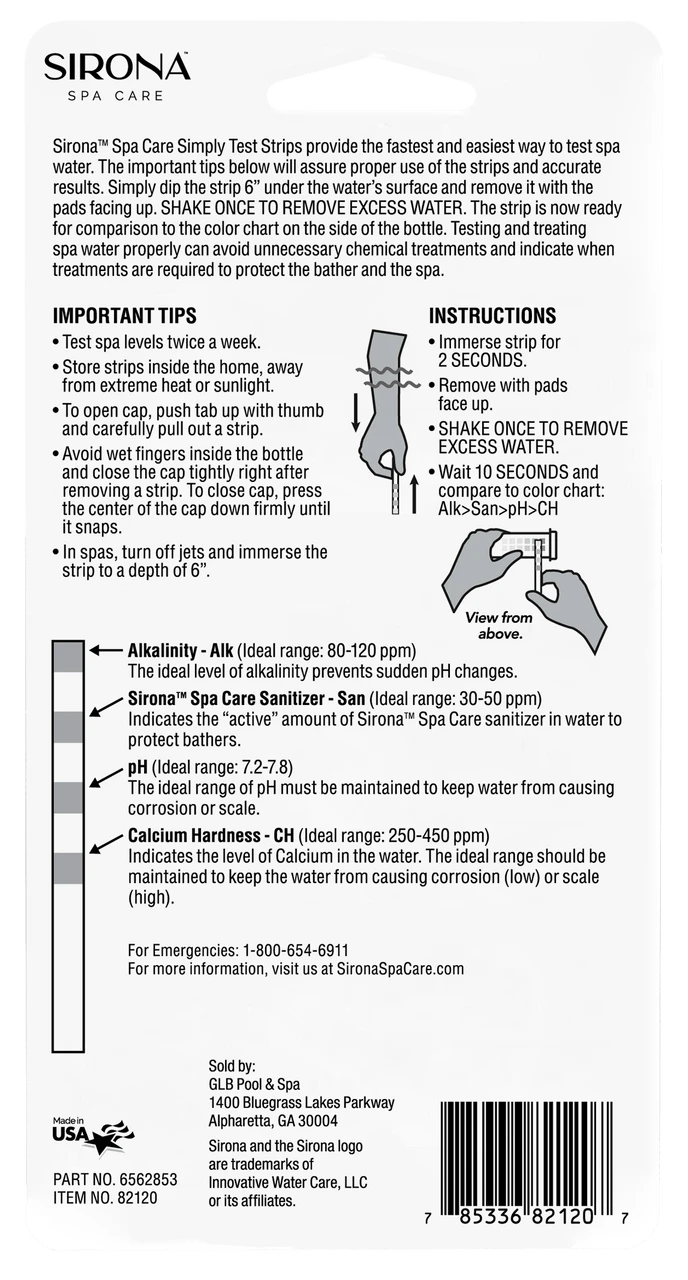 Sirona™ Simply Solution: These test strips are part of the Sirona™ Simply line, offering a bromine-free, chlorine-free biguanide solution for your spa.