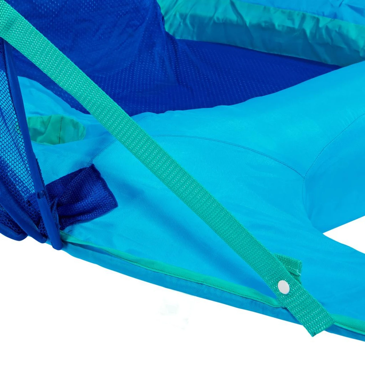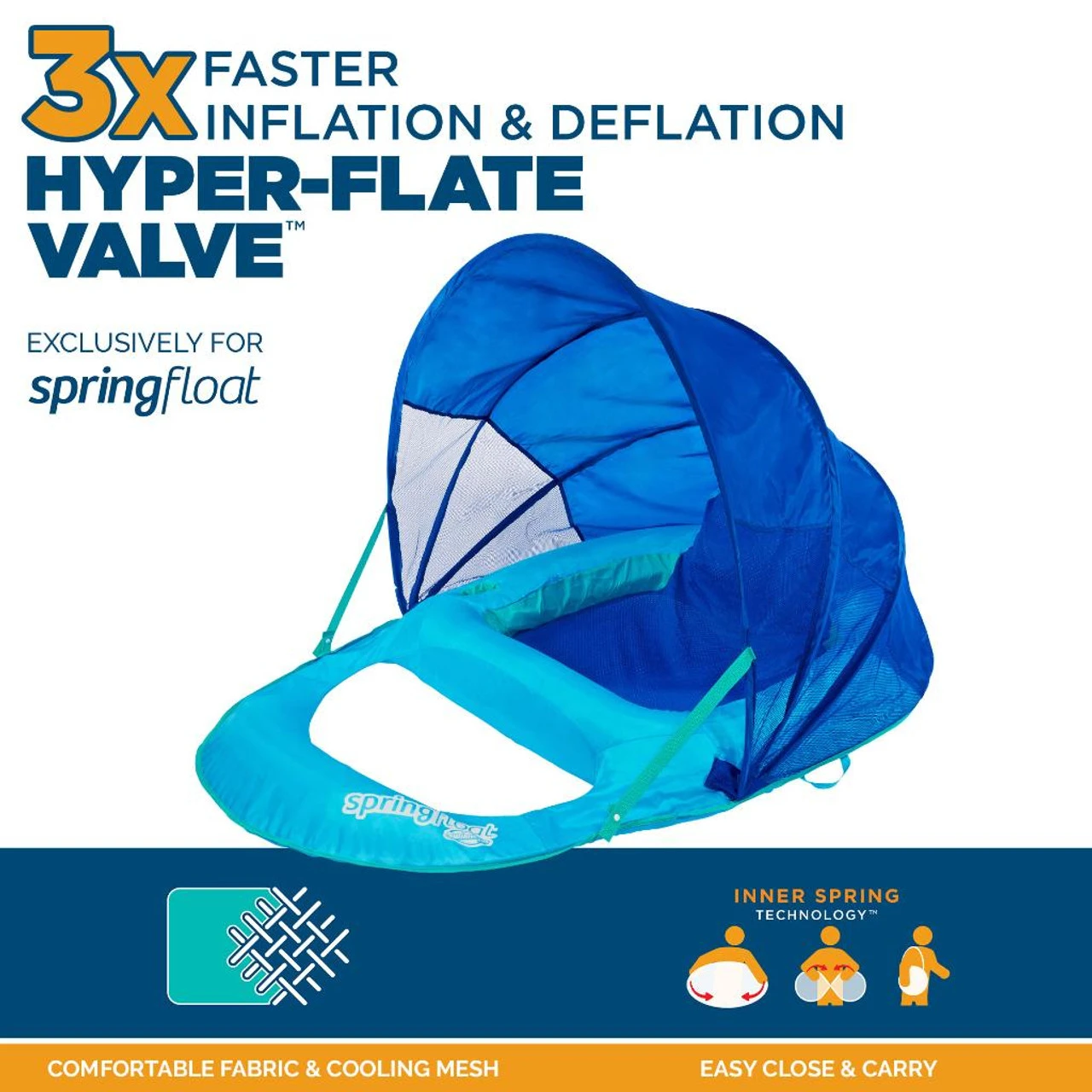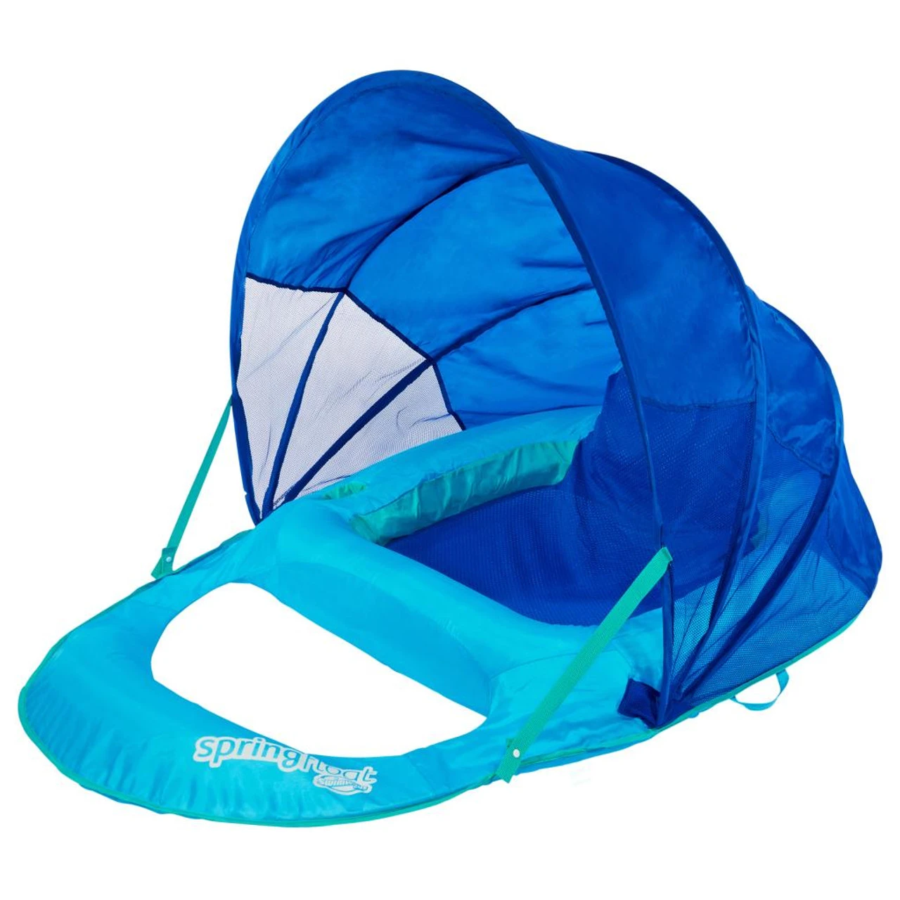 The SwimWays Spring Float Recliner with Canopy pool float combines all the comfort of the Spring Float Recliner plus added shade!